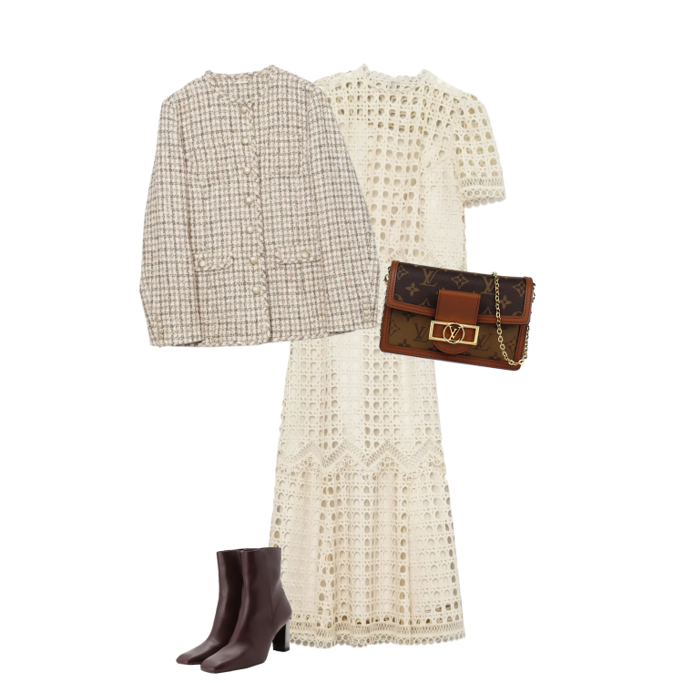 キルティングジャケットにビビッドなオレンジパーカーを重ねた、スポーティな着こなし。ホワイトのワイドパンツで軽やかさを加え、ベージュのダッドスニーカーでトレンド感をプラス。ブラックのハンドバッグが全体を引き締めるアクセントに。