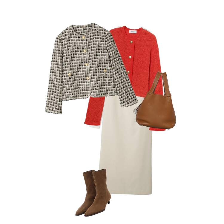グレーのスタンドカラーコートに、白フリルがロマンティックなブラックドレスを合わせた、エレガントなスタイル。オレンジの幾何学柄ショルダーバッグが鮮やかなアクセントとなり、モノトーンコーデに遊び心をプラス。ブラックのショートブーツでシックにまとめ、全体を洗練された印象に。フリルの甘さとシャープなシルエットが絶妙にバランスした、大人のフェミニンスタイルです。