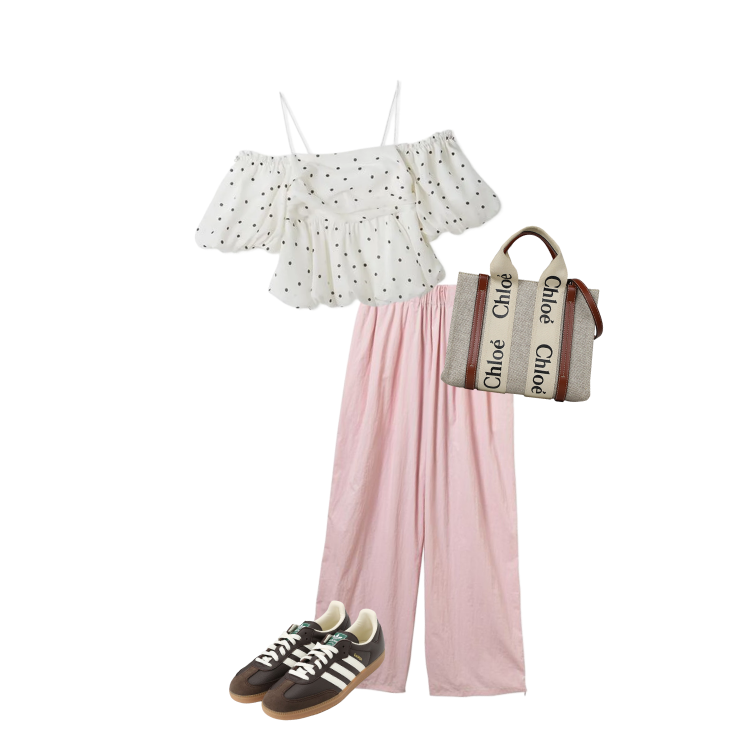 レースの甘めのスカートにはメンズバッグを合わせてスポーティに