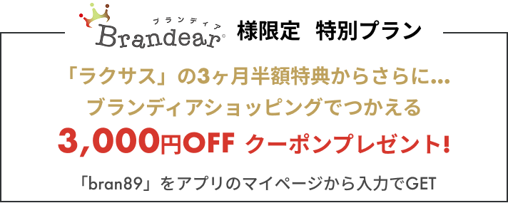 バッグレンタル発送完了後、10日以内にラクサスアプリのトークでブランディアショッピング3,000OFFクーポンコードをお送りします。