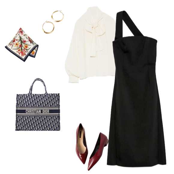ベーシックなワンピースはワンショルダーで今っぽくアップデート。「ブックトート」でコーデに華やかなアクセントをプラス。
