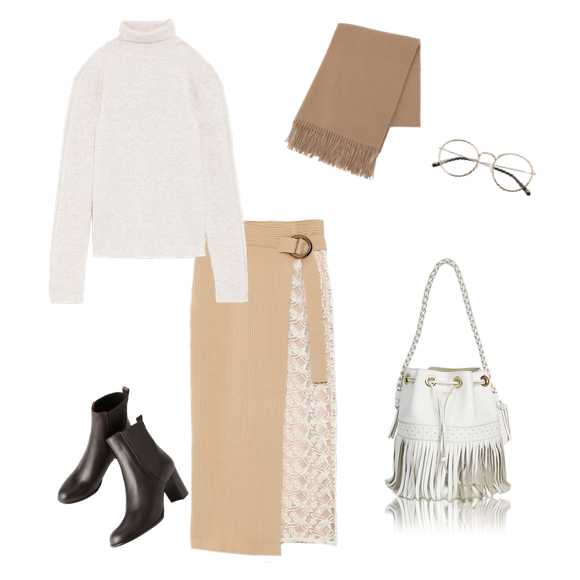 タートルとタイトスカートを合わせたフェミニンコーデは、全体をベージュトーンで統一することで大人っぽく仕上がります。フリンジがポイントの「カーニバル」はアクセサリー感覚で取り入れたいバッグ。
