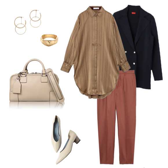 ゆったりとしたシルエットのシャツにはテーパードパンツを合わせるとコーデが締まります。ロエベの「アマソナ」でコーデをさらにスタイリッシュに。