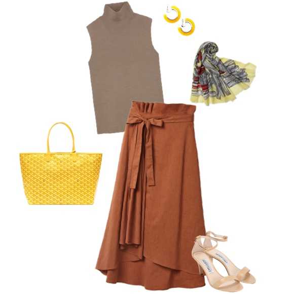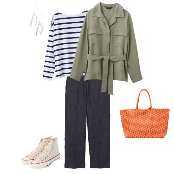明るいオレンジのサンルイPMを持つだけで、いつものコーデとは違った雰囲気になれます。