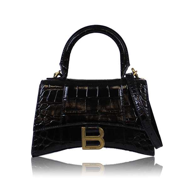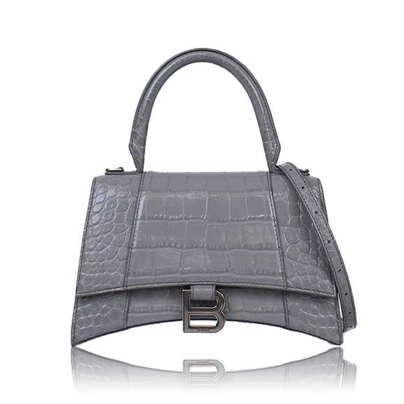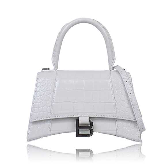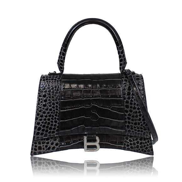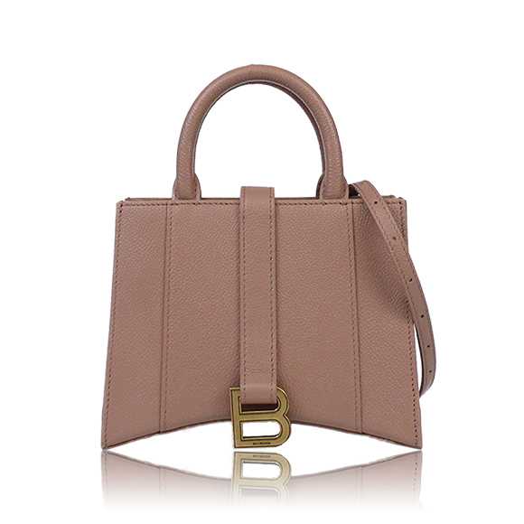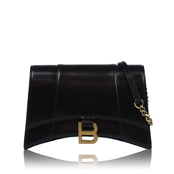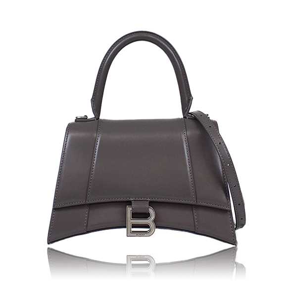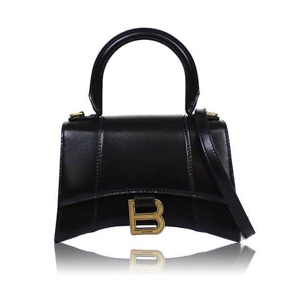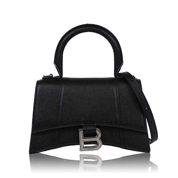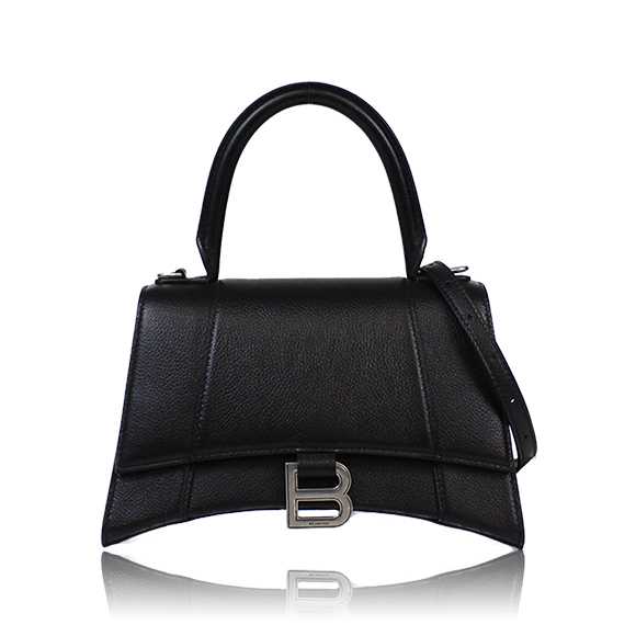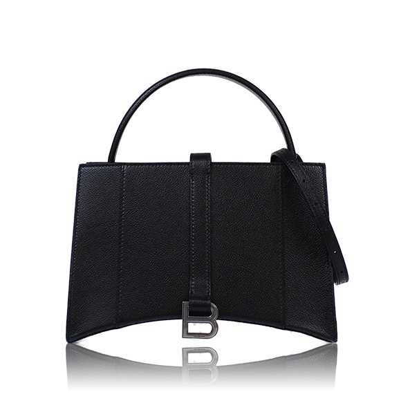 創立者Cristobal Balenciaga(クリストバル・バレンシアガ)のシグネチャーであるバスクウエストコート(ウエスト部分のくびれたコート)のシルエットを砂時計【HOURGLASS(アワーグラス)】に見立てたもので、美しくカーブを描いた底部とフラップ部分のBのロゴがポイントのきちんと感も備えたバッグです。