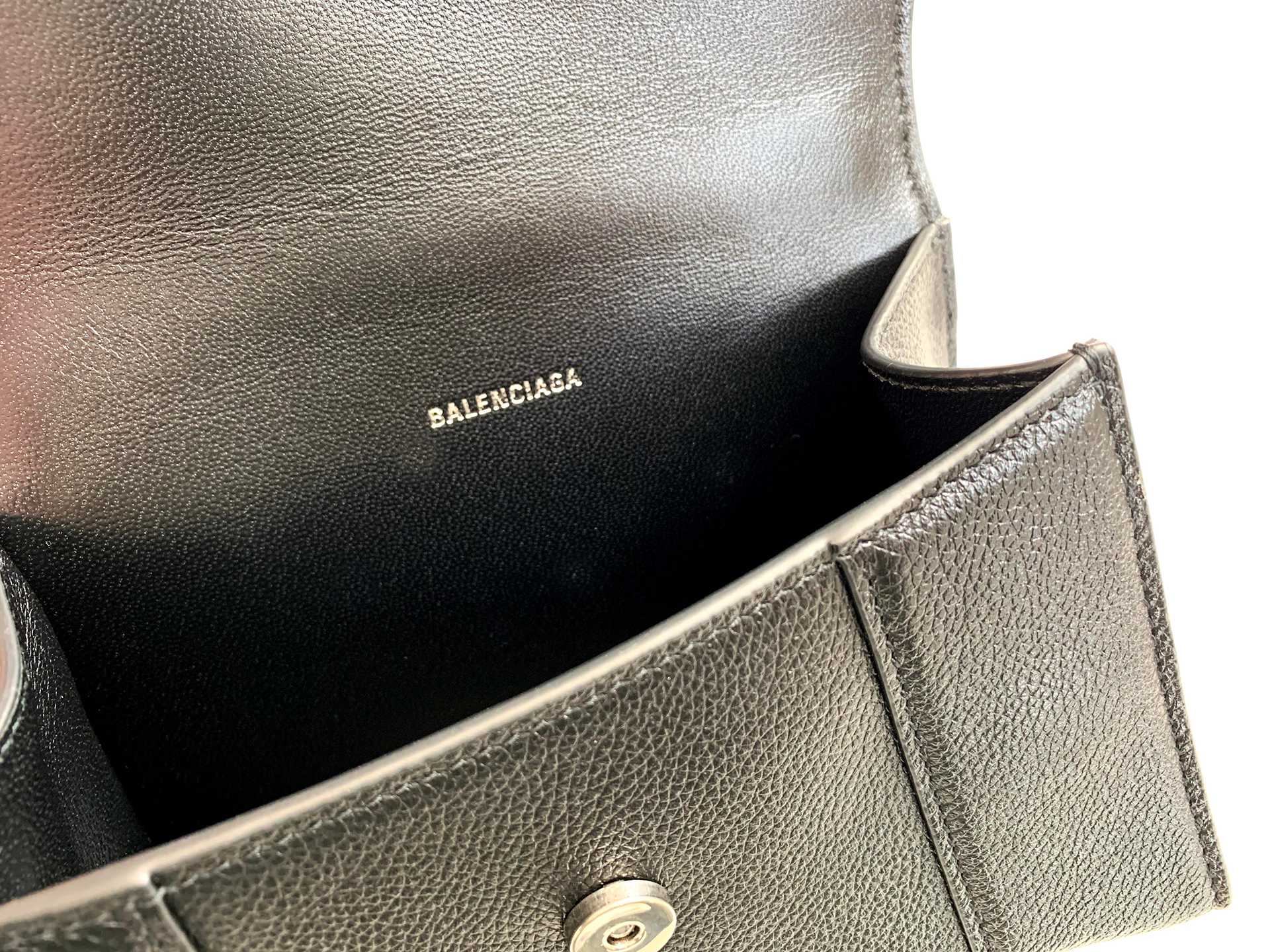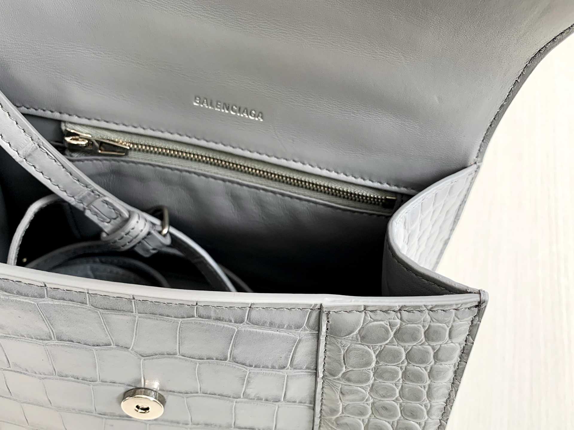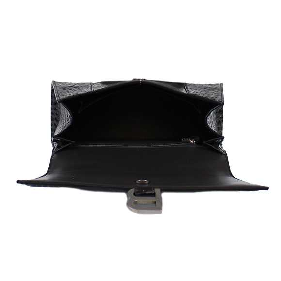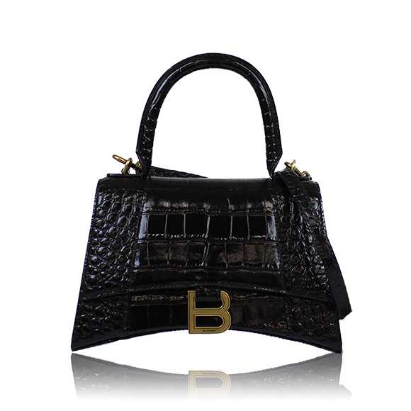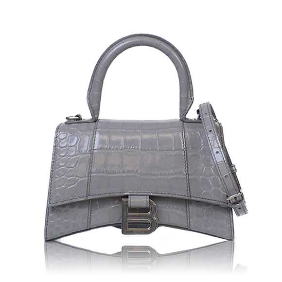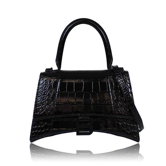 創立者Cristobal Balenciaga(クリストバル・バレンシアガ)のシグネチャーであるバスクウエストコート(ウエスト部分のくびれたコート)のシルエットを砂時計【HOURGLASS(アワーグラス)】に見立てたもので、美しくカーブを描いた底部とフラップ部分のBのロゴがポイントのきちんと感も備えたバッグです。
