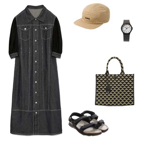 モダンなジオメトリック柄ラージハンドバッグを主役に、シンプルながらもこなれたデニムワンピースを合わせることで、リラックスしつつも洗練された雰囲気に仕上がります。