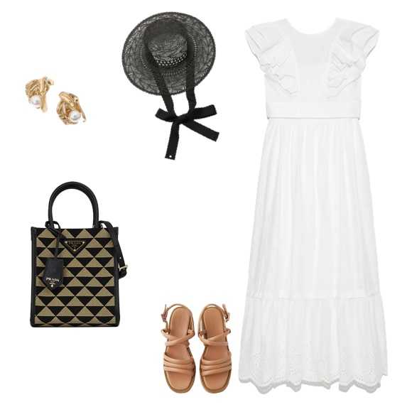 清涼感と華やかさを兼ね備えたホワイトドレスを主役に、リゾートらしいナチュラルさと上品さを絶妙にミックスしたスタイリング。