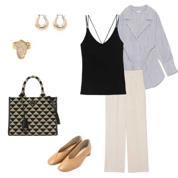 小物でさりげなくリゾート感を添えることで、特別感のあるディナータイムにもふさわしい装いに仕上がっています。
