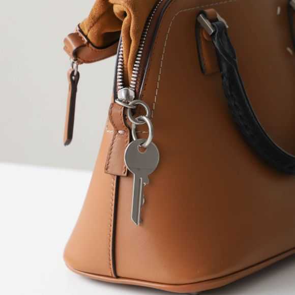 しなやかなコードで丁寧に包まれたキーが、バッグの片側にさりげなく添えられています。
