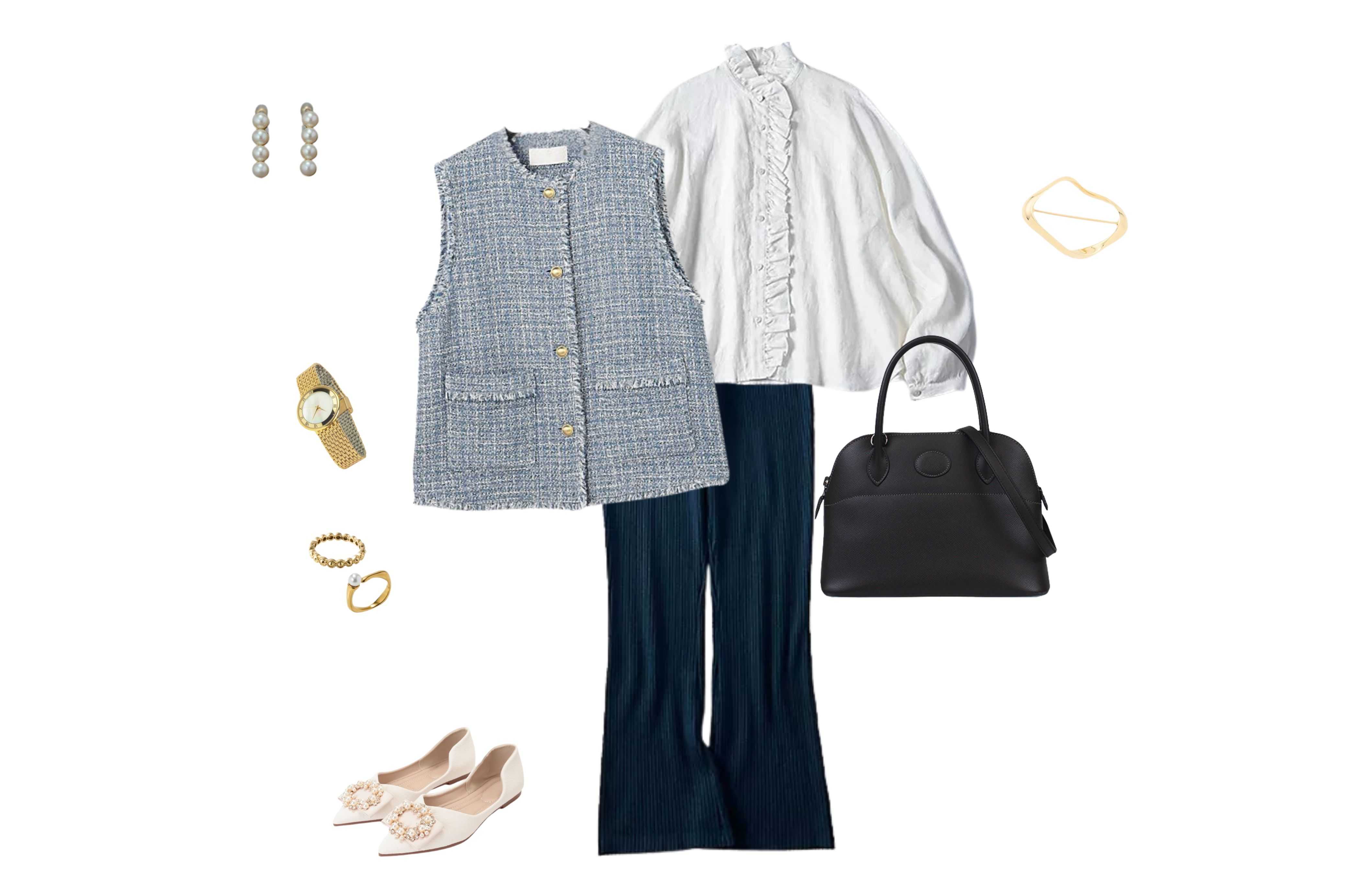 ツイードベストとフリルブラウスを主役に、ネイビーのパンツで全体をすっきりとまとめています。 程よく華やぎのあるトップスに対し、ブラックのマルゴー10を合わせることで、甘さを抑えた大人のフォーマルスタイルが完成します。卒業式・入学式、式典、改まった会食など、写真に残るシーンでも安心して選べるのがこのバッグです。