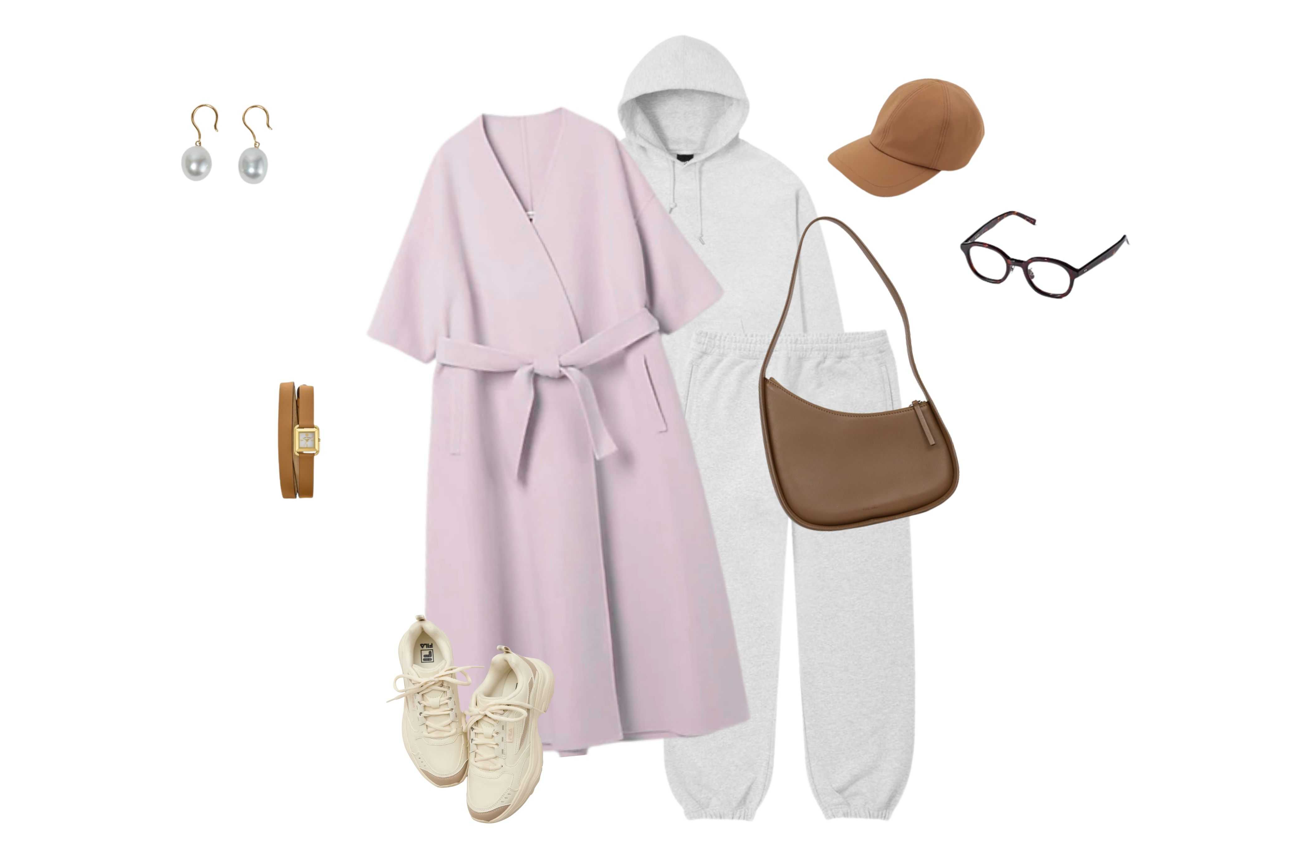 スウェットのセットアップに淡いトーンのロングコートを重ね、リラックス感の中にきちんと感を添えています。カジュアルなアイテムが中心でも、ハーフムーンバッグのなめらかなレザーと曲線的なフォルムが加わることで、全体がラフになりすぎず、大人らしいバランスになります。