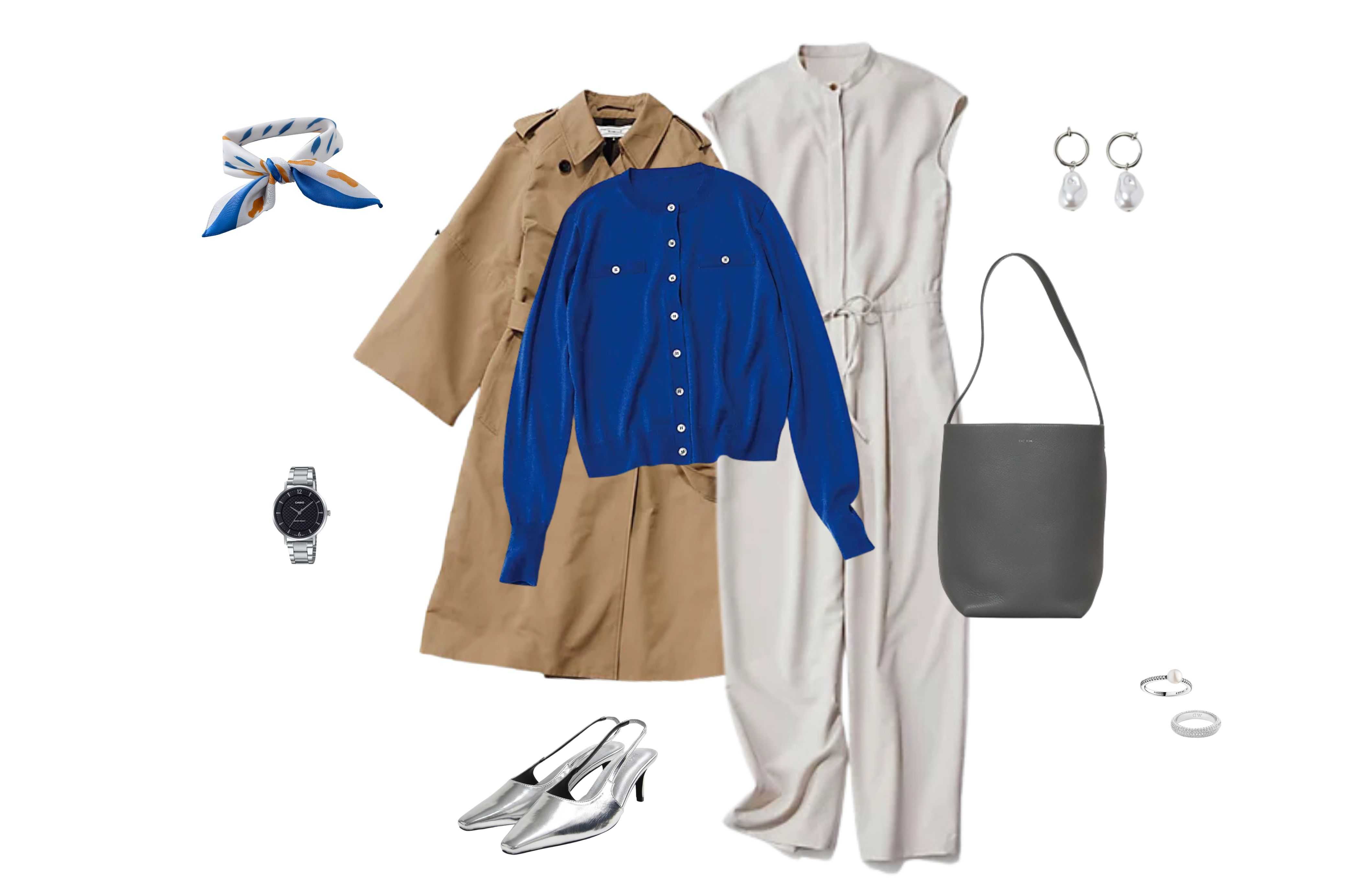 淡いトーンのオールインワンにトレンチコートを重ねたきれいめスタイルに合わせ、知的で落ち着いた印象に仕上げています。パークトートが、コーディネートに自然になじみつつ、全体を引き締める役割を果たします。
